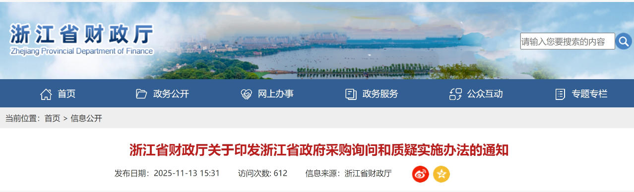 近日,为规范政府采购询问、质疑行为,保护政府采购当事人合法权益,进一步提高采购效率,优化政府采购营商环境,浙江省财政厅印发《浙江省政府采购询问和质疑实施办法》,自2026年1月1...