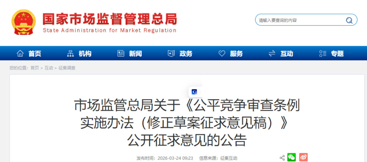 市场监管总局关于《公平竞争审查条例实施办法(修正草案征求意见稿)》公开征求意见的公告 为深入贯彻党的二十大和二十届历次全会精神,认真落实中央经济工作会议部署,市场监管总...